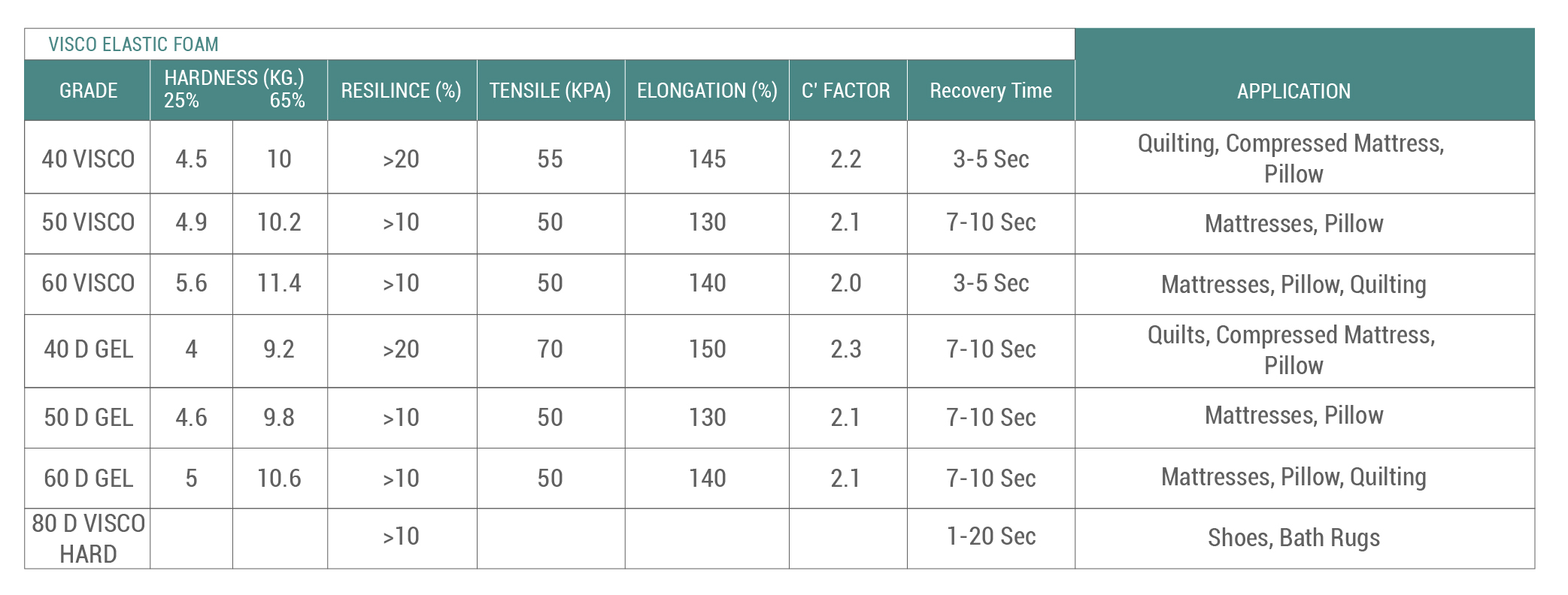 Viscoelastic/Memory Foam is also known as a memory Foam. Memory foam reacts to body shape and temperature to conform to the body.